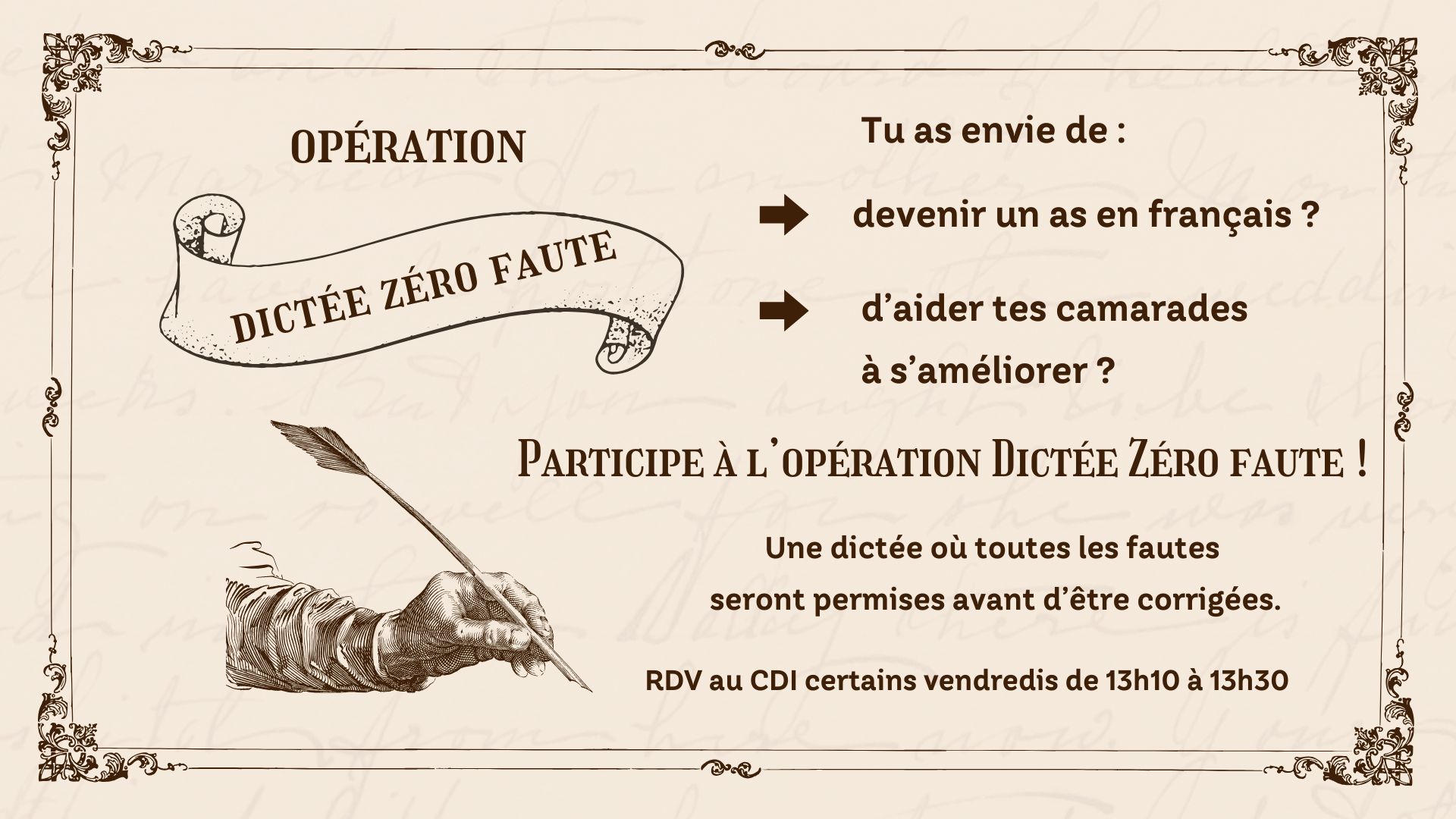 Un vendredi sur 2, viens au CDI pour participer à une dictée où toutes les fautes sont permises, mais ensuite corrigées !