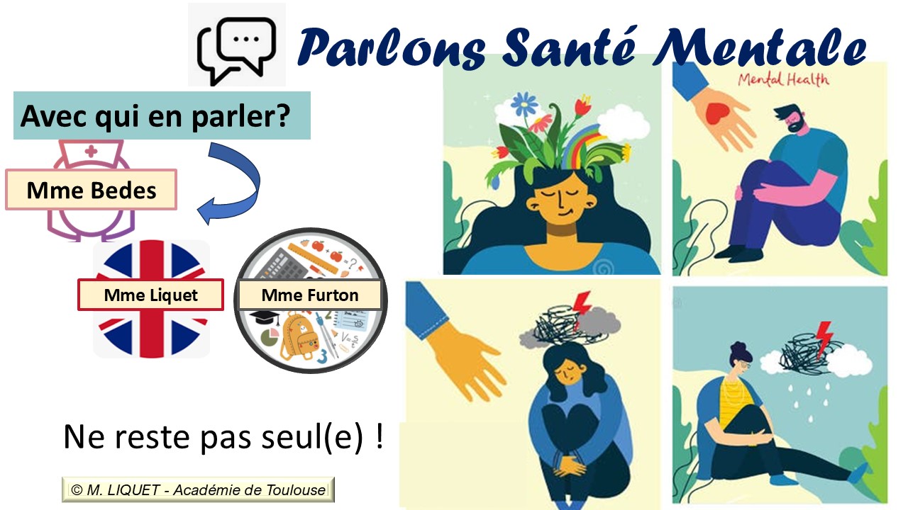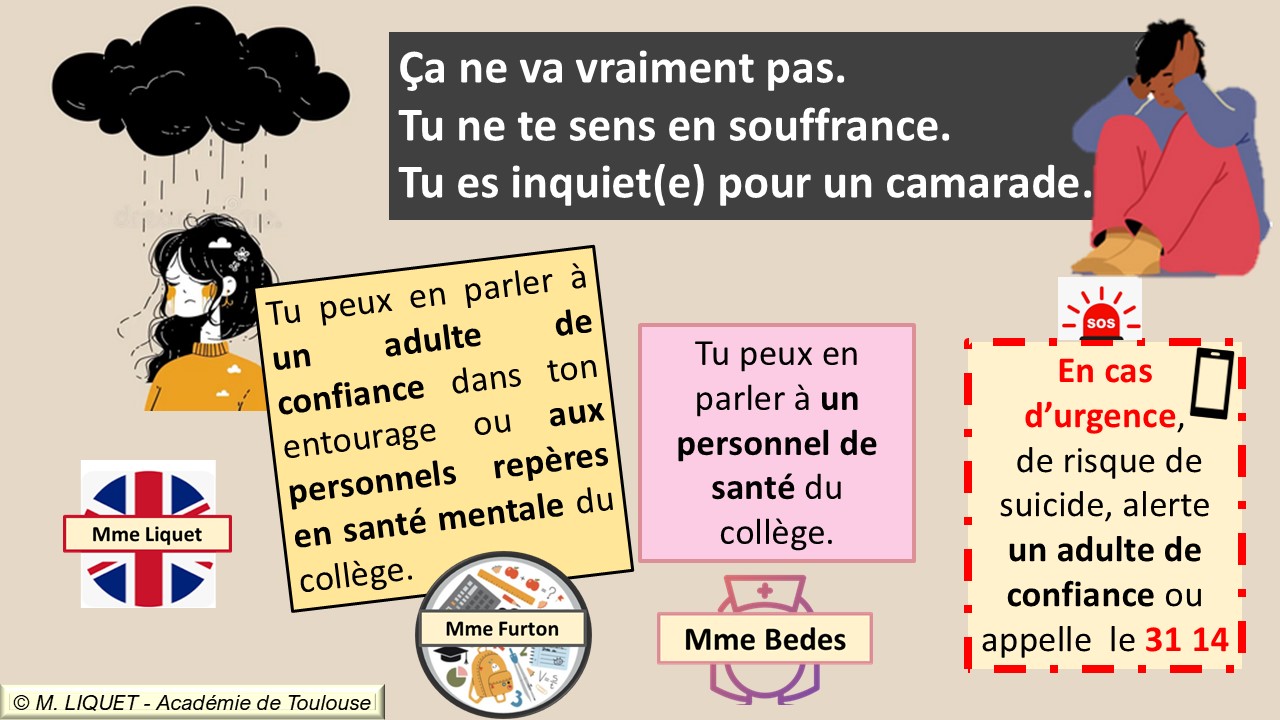Au collège Lucie Aubrac, nous avons à cœur de parler de santé mentale. Nous mettons en place une équipe de personnels repères pour. N'hésitez pas à vous adresser à nous si vous en éprouver le besoin.