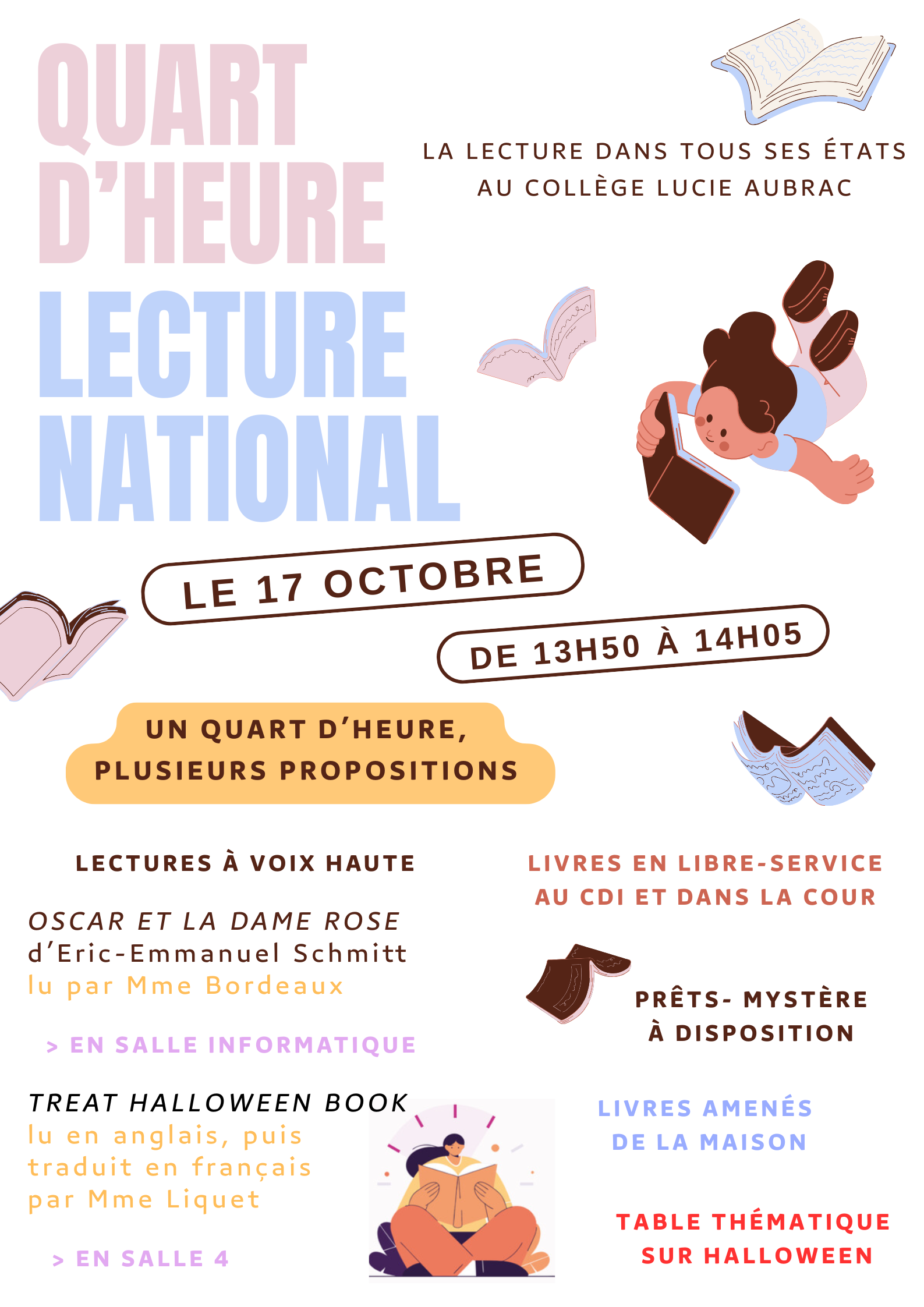 Vendredi 17 octobre, le collège Lucie Aubrac participera au quart d'heure lecture national avec plusieurs propositions, faites votre choix !