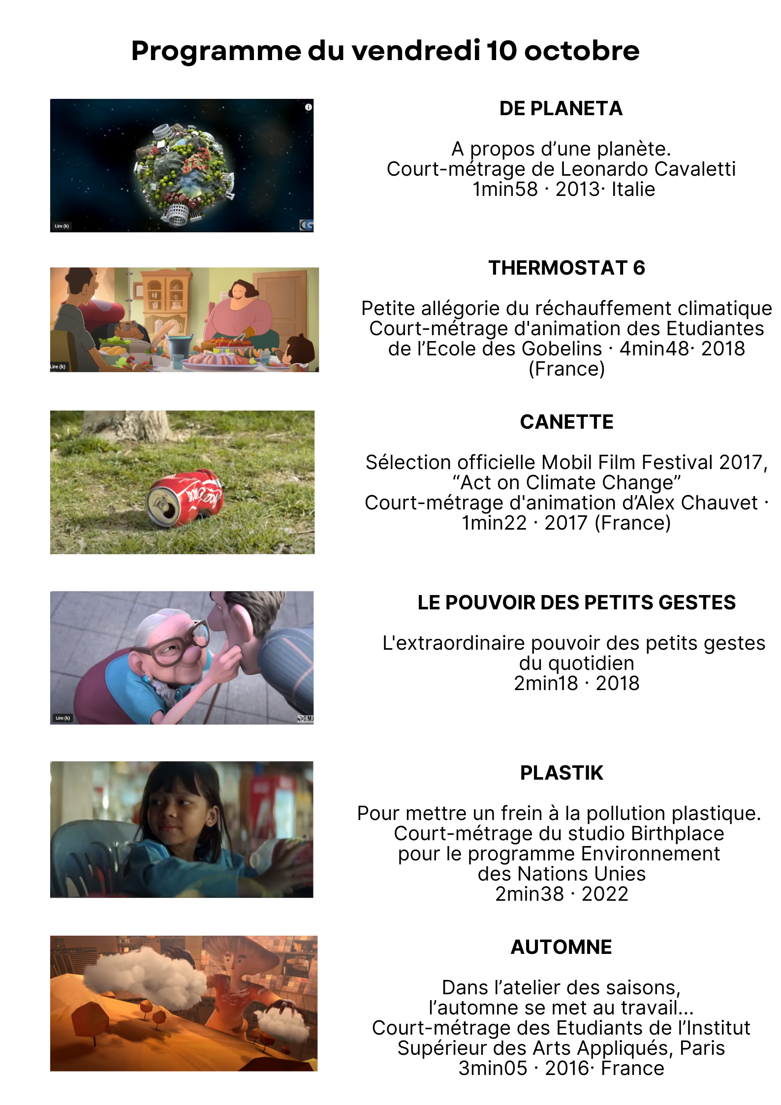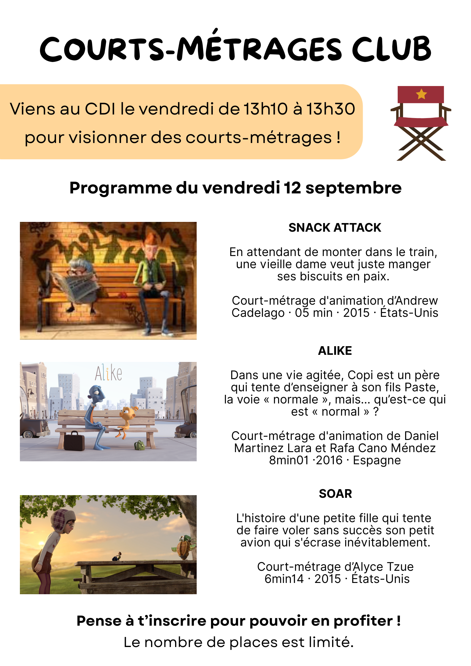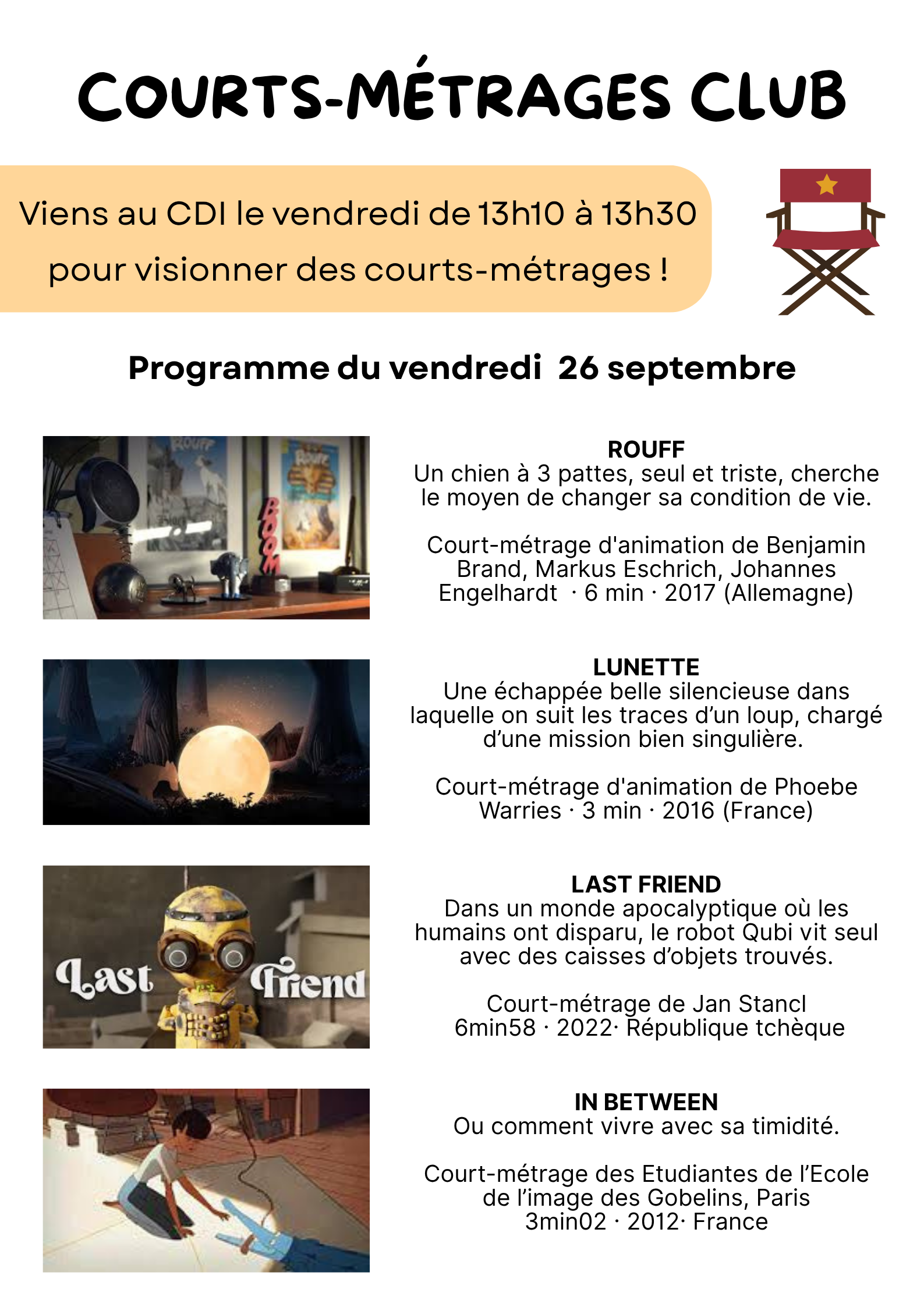 Un vendredi sur 2, à la pause méridienne, de 13h10 à 13h30, profite de la projection d'une sélection de courts-métrages !