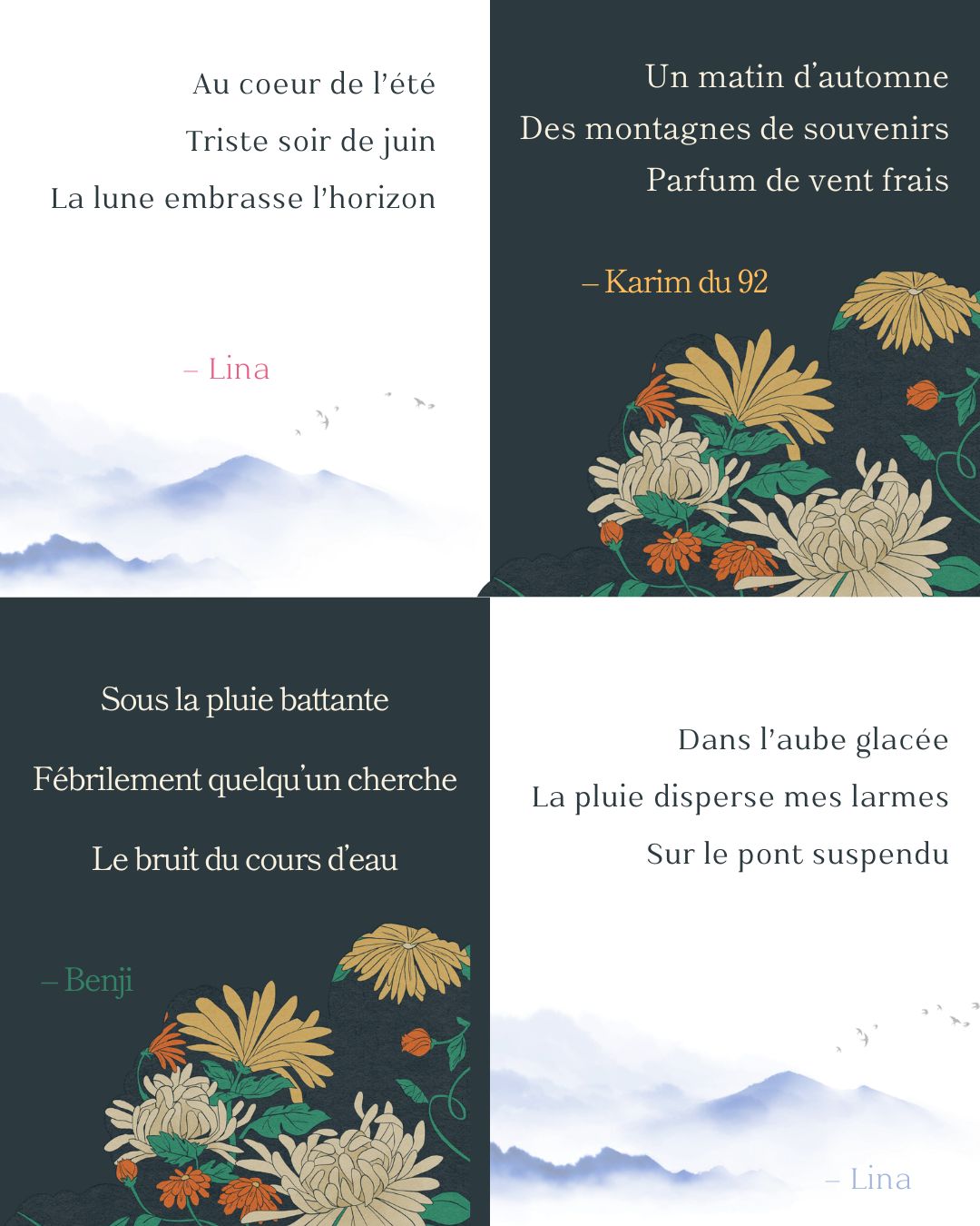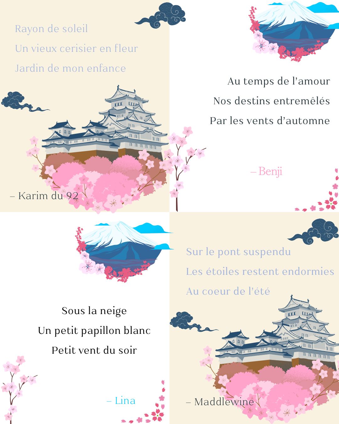 Dans le cadre de la Quinzaine du Japon en Occitanie, un atelier d'écriture dirigée de haïkus a été menée au CDI avec certains élèves. Voici quelques-unes des réalisations :