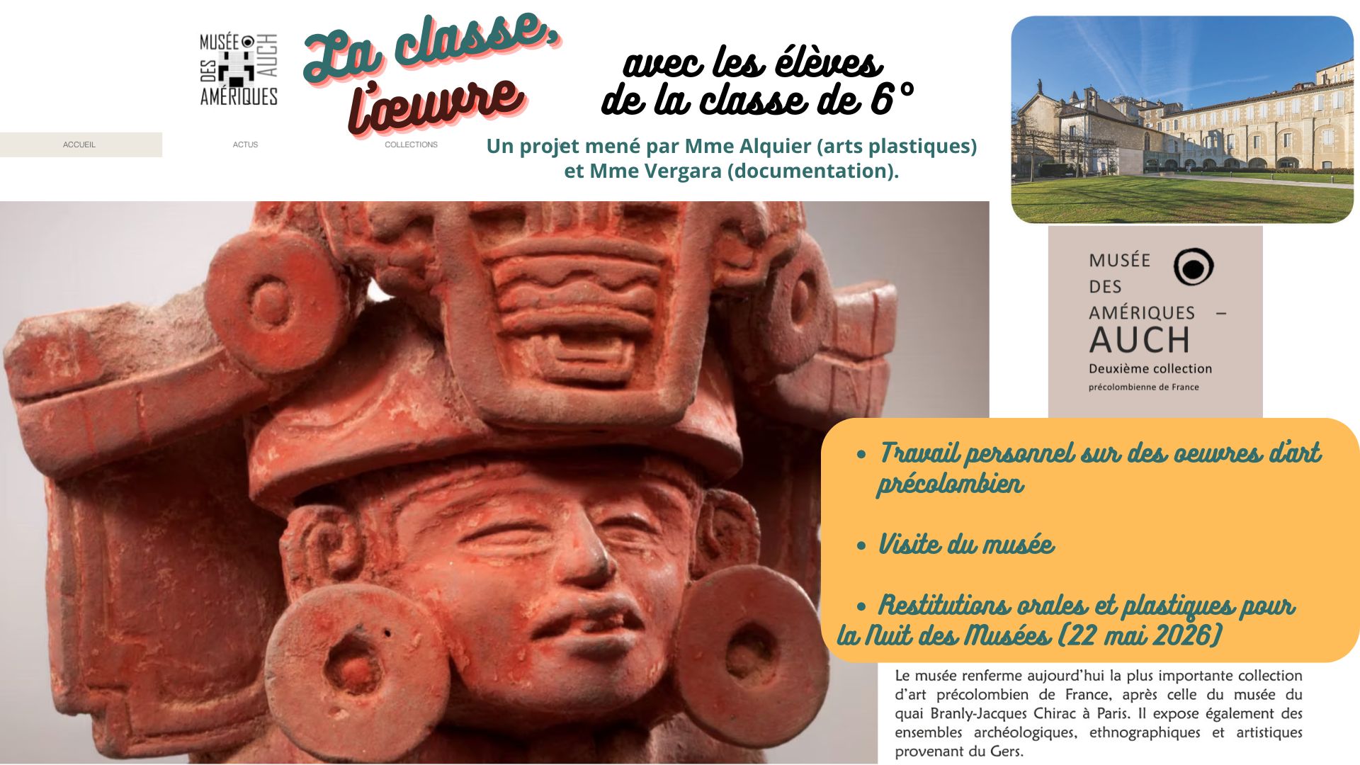 Le projet La classe, l'oeuvre, mené depuis le mois de novembre 2025 par Mme Alquier (arts plastiques) et Mme Vergara (documentaliste, éducation aux médias et à l’information) avec les élèves de la classe de 6ème, en partenariat avec le Musée des Amériques d'Auch, touche à sa fin !