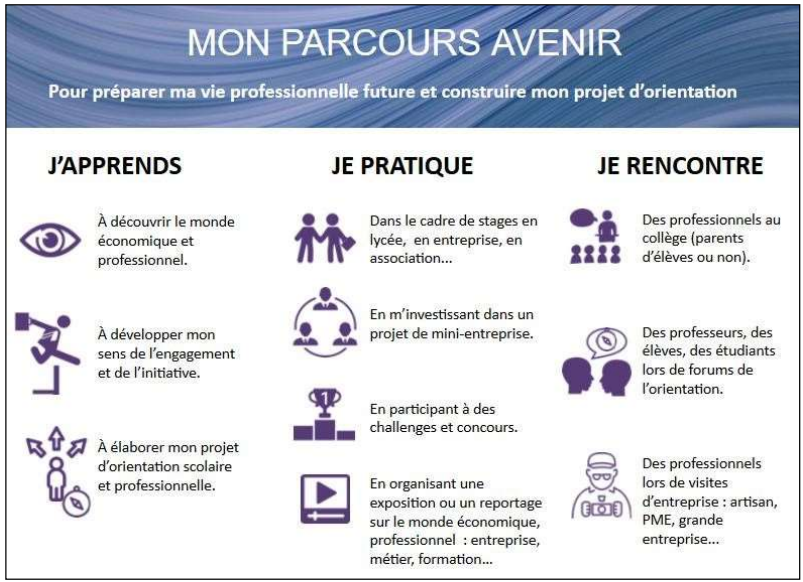 Depuis la rentrée 2015, les 4 parcours éducatifs – Avenir, éducation artistique et culturelle, éducatif de santé, citoyen – sont mis en œuvre progressivement afin de permettre de suivre le travail de l’élève dans ces différents domaines.